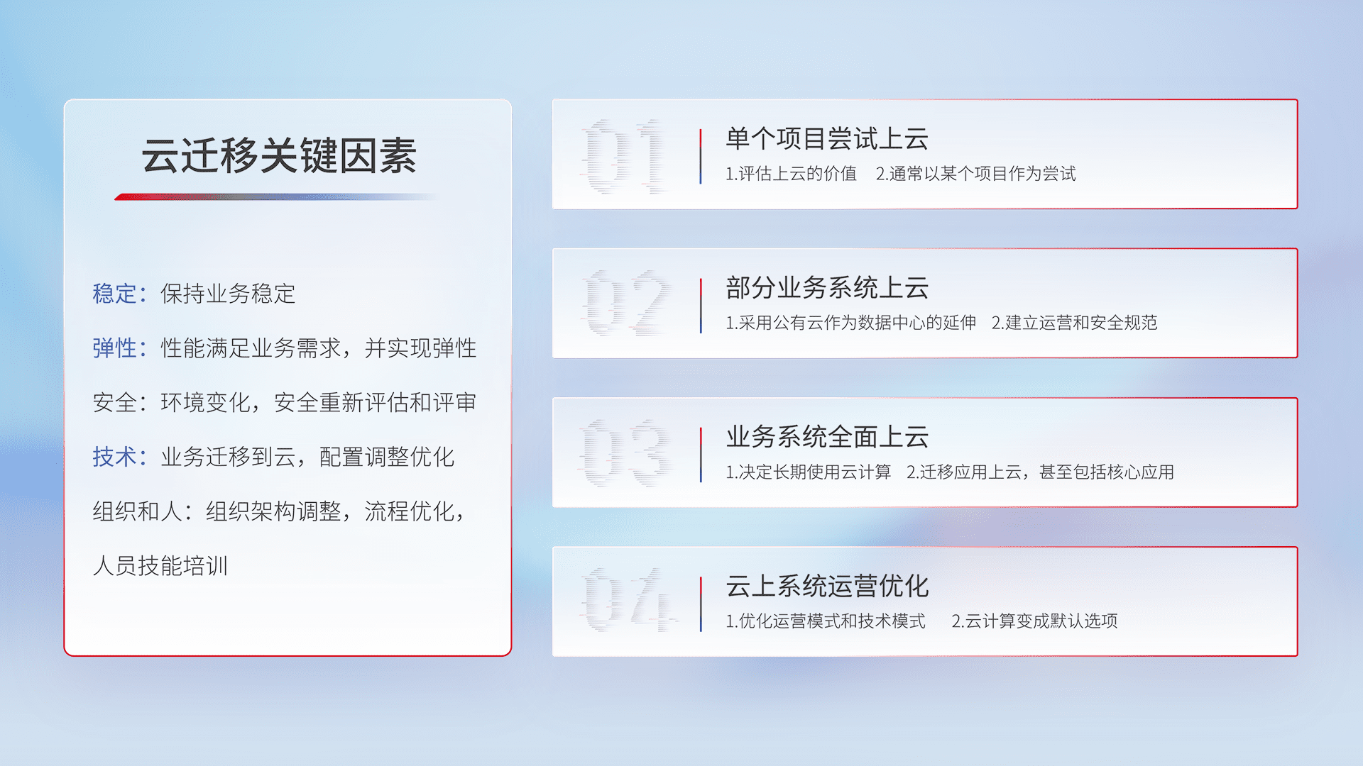 结合实际业务,,,从规划设计、、、云平台选型、、、云原生改造、、、数据迁移、、、集成交付,,,,迁移全过程为客户识别最佳上云路径,,做好风险识别管理,,,,设计网络架构、、、、身份权限、、、安全审计合规、、、、操作审计、、、日志审计、、、监控告警策略、、、、多站点容灾设计等,,,对云上基础设施进行整体规划,,,,提升IT治理水平,,,,以满足弹性、、、高可用、、、高性能的需求。。