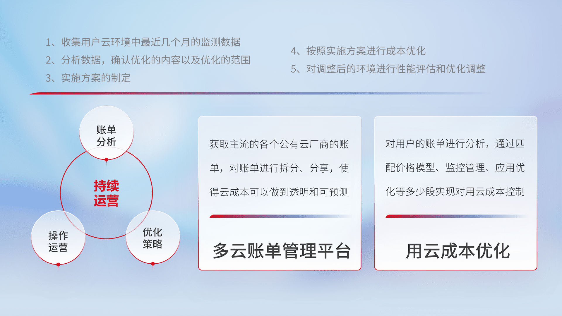 通过多云纳管,,,以统一的资源数据模型把客户的云资源进行抽象和封装,,,进而实现对多云资源的统一操作,,,保障云资源管理的可靠性、、稳定性与可用性。。。量身定制化运维内容,,,配置、、开发运维、、补丁管理、、、备份、、、、监控、、认证和访问管理、、、审计和日常巡检等,,,保障在用云过程中的可靠度,,,,稳定度以及高可用率。。